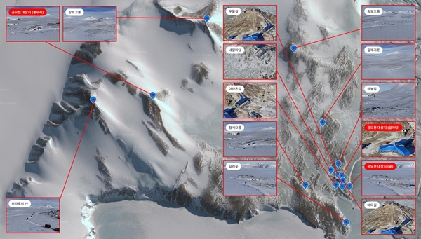 공모 대상은 총 16개의 신규 지명 대상 중 장보고기지 앞마당과 앞 곶(바다 쪽으로 부리 모양으로 뾰족하게 뻗은 육지), 빙저호, 브라우닝 산 근처 봉우리 등 4곳이다.