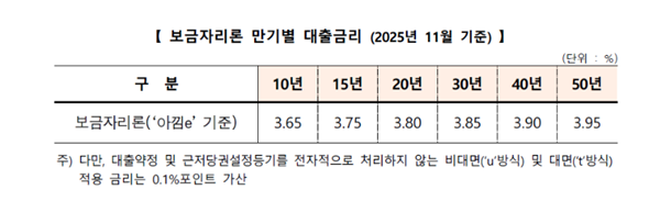 이에 `아낌e-보금자리론` 기준으로 연 3.65(10년)~3.95%(50년)가 적용된다.