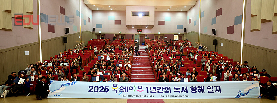 [에듀뉴스] 정근식 서울특별시교육감이 23일 서울 중구 동국대학교에서 열린 가족독서 캠페인 '온 가족 북웨이브'의 1년 여정을 돌아보는 ‘2025 북웨이브, 1년간의 독서 항해일지’ 행사에 참석해 기념촬영을 하고 있다.