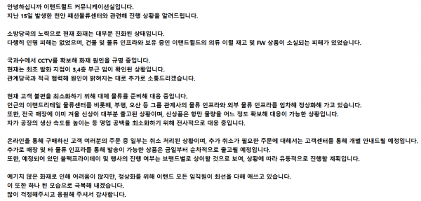 이랜드 천안물류센터 화재 관련 이랜드월드 입장문