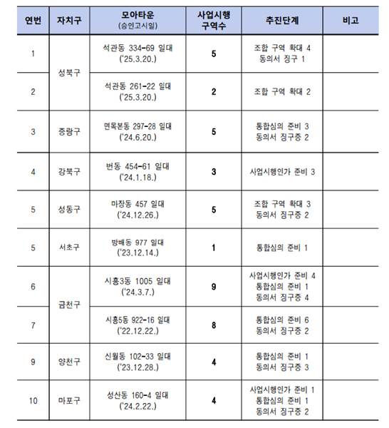 시에 따르면 현재 추진 중인 116개 모아타운 내 93개 모아주택이 조합 설립을 마치고 사업을 추진 중이며, 사업시행계획 단계에서 공정 지연이 집중적으로 발생했다. 조합 설립 초기 사업 추진 역량과 전문성이 부족해서다. 주요 원인으로는 구역 확대를 위한 추가 동의서 징구, 조합 설립 초기 업체 선정 기간 소요, 인가 절차 도서 작성 기간 소요, 시공자와 공사비 협의ㆍ조정 등이 있다.