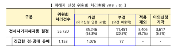 그간 위원회에서 최종 결정한 전세사기 피해자 등은 총 3만5246건(누계), 긴급 경ㆍ공매 유예 협조요청 결정은 총 1076건(누계)이다. 결정된 피해자 등에게는 주거, 금융, 법적 절차 등 총 5만1534건(누계)을 지원하고 있다.