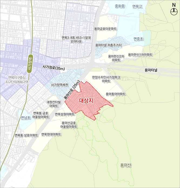 시는 주변 용마산 경관과 기존 주택 단지를 고려해 용도지역을 제1종 및 제2종(7층 이하)일반주거지역을 제2종일반주거지역으로 상향하고 `2030 도시ㆍ주거환경정비기본계획에 따라 사업성 보정계수(2)를 적용해 사업성을 크게 개선했다.