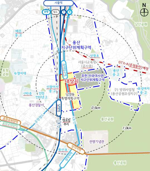 인접해 있는 주한미대사관과 용산공원을 고려한 자연스러운 스카이라인 창출을 위해 높이 계획은 한강대로변 100m, 용산공원변 70m로 차등 적용했다. 공공기여시설로는 저출산ㆍ고령화 시대에 대응하기 위한 액티브 어르신 여가ㆍ문화시설과 공공 산후조리원 도입을 계획했다.