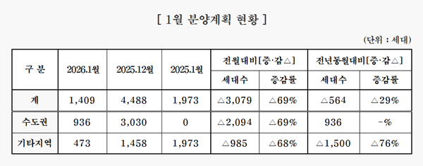 [아유경제_부동산] 중견 주택업체, 올해 1월 1409가구 분양… 전년 동월비 29% 감소