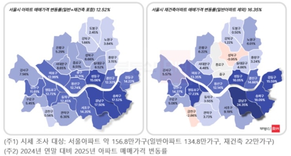 최근 부동산R114에 따르면 서울 아파트 매매가격 변동률 조사 결과, 지난해 아파트값은 2024년 말 대비 12.52% 올랐다. 개별 자치구 중 송파구(17.52%)와 강남구(17.50%)가 각각 17% 이상 오르며 높은 상승률을 기록했고, 이어 성동구(15.06%), 강동구(14.22%), 서초구(14.2%) 순으로 오름폭이 컸다.