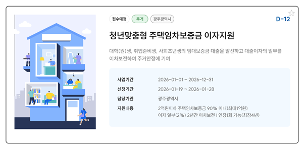 [아유경제=조명의 기자] 광주광역시는 무주택 청년의 주거비 부담 완화를 위한 청년맞춤형 주택임차보증금 이자지원사업 대상자를 모집한다고 최근 밝혔다.