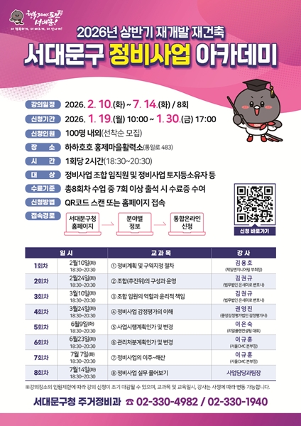 [아유경제=조명의 기자] 서울 서대문구는 재개발ㆍ재건축 등 도시정비사업에 대한 주민들의 이해를 돕기 위해 올해 상반기에도 `정비사업 아카데미`를 진행한다고 최근 밝혔다.