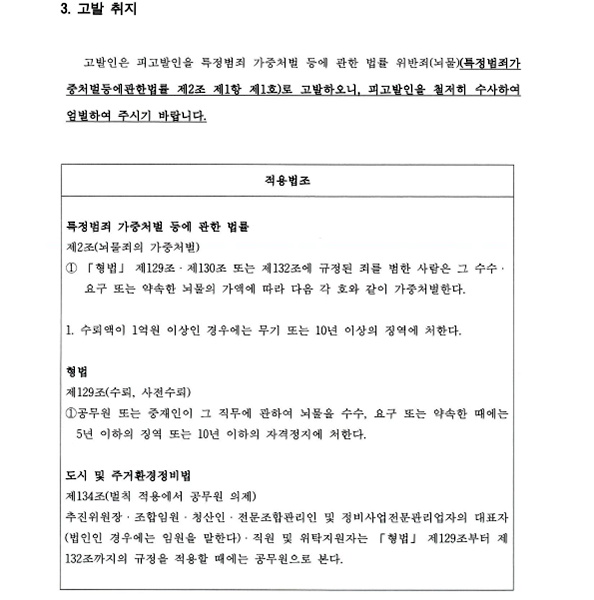고발인은 "「도시 및 주거환경정비법(도시정비법)」에 따라 재개발 조합장은 「형법」상 공무원으로 의제된다"며, "조합장의 행위는 뇌물 액수가 1억 원 이상에 해당해 특정범죄가중처벌법 적용 대상"이라고 밝혔다.