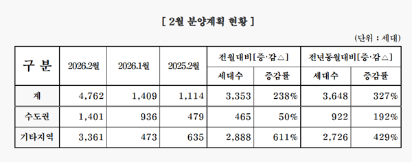 [아유경제_부동산] 중견주택업체, 올해 2월 4762가구 분양… 전년 동월비 327% 증가