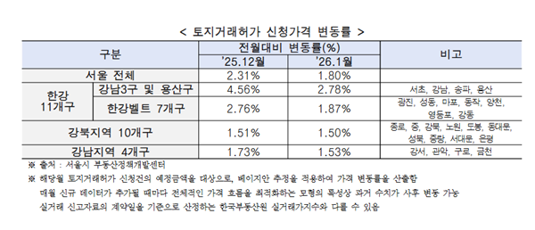 권역별로는 강남 3구(강남ㆍ서초ㆍ송파구)와 용산구가 2.78%, 한강벨트 7개 구(광진ㆍ성동ㆍ마포ㆍ동작ㆍ양천ㆍ영등포ㆍ강동구)가 1.89%로 시 전체 평균(1.8%) 보다 높았으나 외곽 자치구에 비해 상대적으로 상승률 둔화 폭이 컸다. 시는 강남 3구ㆍ용산구ㆍ한강벨트 7개구에서 중ㆍ대형 이상 규모의 신청 건수가 전월 대비 감소하면서 상대적으로 고가 아파트 거래가 위축되며 상승세 둔화에 영향을 미쳤다고 분석했다.