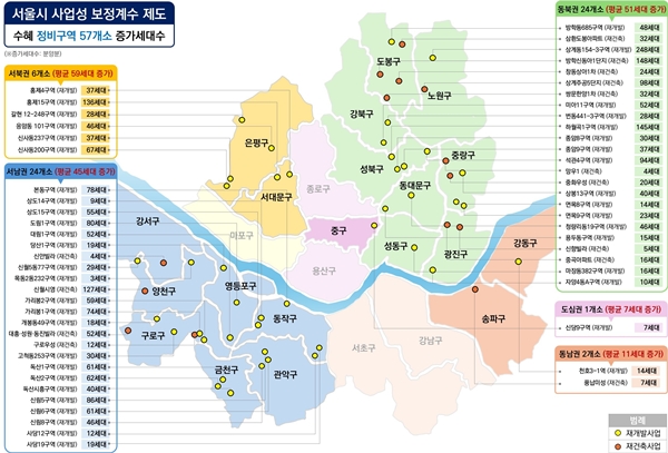 시에 따르면 사업성 보정계수가 적용된 재개발ㆍ재건축 사업지 57곳 중 95%에 달하는 54곳이 강북권(30곳)과 서남권(24곳)에 집중돼 지간 사업성 격차를 좁혀 지역 균형발전 측면에서 효과가 두드러졌다.