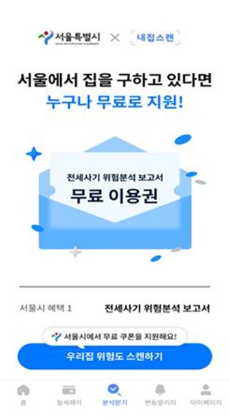 서울 지역에서 임대차계약을 예정한 만 39세 이하 청년은 서울주거포털과 청년몽땅정보통의 전세사기 위험분석 보고서 배너를 통해 `내집스캔`에 접속한 뒤, 시 무료 쿠폰을 적용해 이용할 수 있다. 이달 25일부터 1인당 최대 2회까지 무료 지원된다.