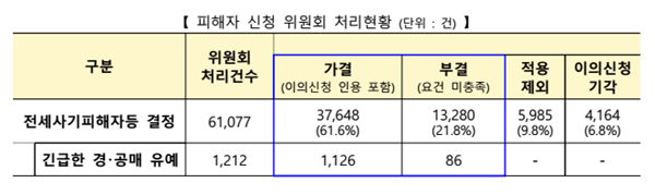 그간 위원회에서 최종 결정한 전세사기 피해자 등은 총 3만7648건(누계), 긴급 경ㆍ공매 유예 협조요청 결정은 총 1126건(누계)이다. 결정된 피해자 등에게는 주거, 금융, 법적 절차 등 총 6만1462건(누계)을 지원했다.