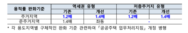 개정안에 따르면 그간 역세권 유형의 준주거지역에만 적용되던 용적률 법적 상한 완화(1.4배)를 역세권 내 일반주거지역과 저층 주거지까지 확대한다. 특례는 3년 한시로 도입하되, 특례 적용 기간 동안 예정지구로 지정된 사업은 3년이 지나도 특례 적용을 지속할 계획이다.