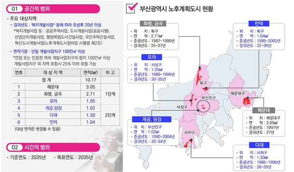 대상지는 화명ㆍ금곡지구와 해운대 지구다. 화명ㆍ금곡 지구는 북구 화명동ㆍ금곡동 일원 271만 ㎡ 규모다. 「노후계획도시 정비 및 지원에 관한 특별법」에 따라 기준 용적률이 232%에서 350%로 상향되며, 계획인구는 기존 7만5000명에서 9만7000명으로 2만2000명 증가했다. 역세권을 중심으로 생활기반시설을 늘려 15분 생활권을 실현하고 인근 금정산과 하천을 연결하는 입체적인 그린블루네트워크를 만든다.