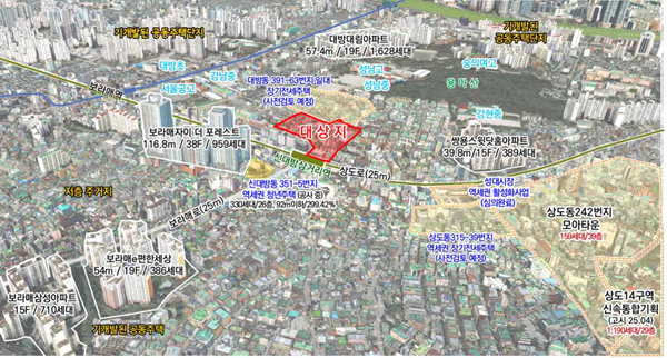 신대방삼거리역세권 활성화사업은 동작구 상도로 69(대방동) 일원 2만1398㎡를 대상으로 지상 39층 공동주택 792가구 및 근린생활시설, 업무시설 등을 복합 조성하는 내용을 골자로 한다.