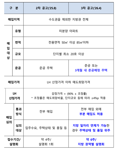 이달 10일 국토교통부(장관 김윤덕ㆍ이하 국토부)와 한국토지주택공사(LH)는 `지방 준공 후 미분양 아파트 3차 매입공고`를 실시한다고 밝혔다. 지난해 8월 발표한 `지방중심 건설투자 보강방안`에 따른 후속 조치다.