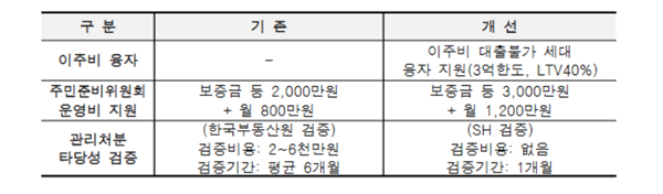 먼저 공공재개발은 금융비용 지원을 중심으로 사업 전 과정을 종합 지원한다. 대출 규제로 이주비 대출이 불가능한 가구에 최대 3억 원(LTV 40%)의 융자 지원을 새로 도입한다. 초기 주민준비위원회 운영비 지원금액도 월 800만 원에서 월 1200만 원으로 확대하고, 평균 6개월 걸리던 관리처분 타당성 검증 절차도 SH가 직접 수행해 1개월로 줄인다. 검증 비용도 기존 2000만 원~6000만 원을 무료로 전환한다.
