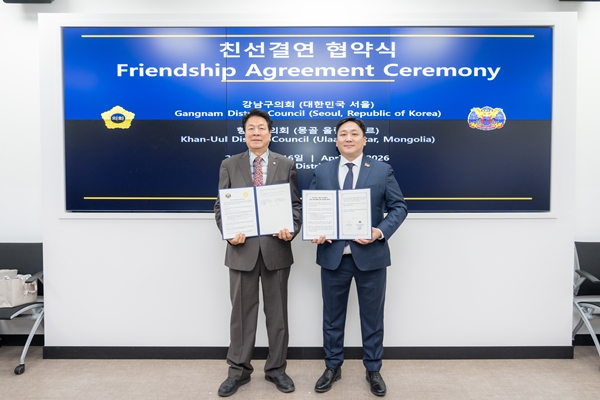 [아유경제=조현우 기자] 강남구의회(의장 이호귀)는 이달 16일 오전 강남구의회를 내방한 몽골 항올구시민대표회의(의장 바트-오르길) 대표단을 접견하고 협약을 체결했다.