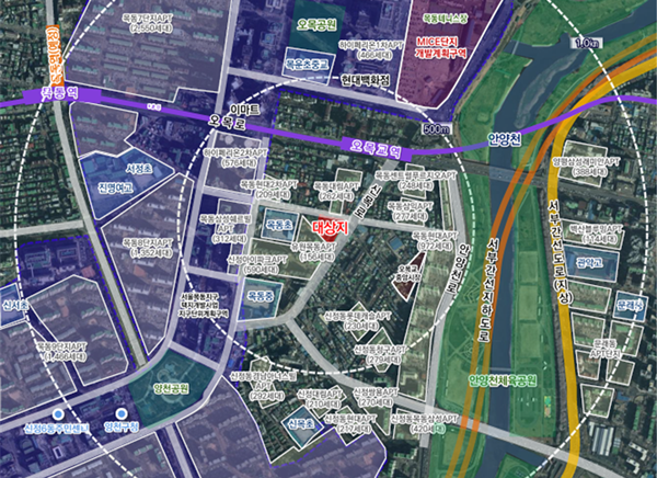 대상지는 오목교역 남측에 위치하며 목동신시가지아파트 단지와 안양천에 둘러싸여 있는 우수한 입지적 특성을 갖추고 있으며, 목동 중심지구의 배후 주거지로서의 개발 잠재력이 높은 지역이기도 하다.