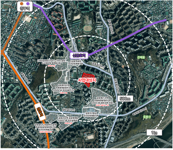 [아유경제=조명의 기자] 서울 성동구 지하철 5호선 신금호역 인근에 지상 최고 21층 아파트 5개동 480가구가 들어선다.
