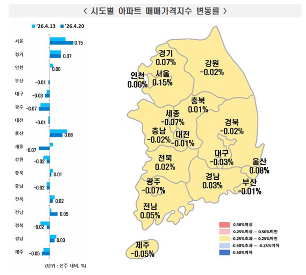 [아유경제=권혜진 기자] 최근 한국부동산원이 발표한 `주간아파트 가격동향`에 따르면 2026년 4월 3주(지난 20일 기준) 전국 아파트값은 상승(0.04%)을 기록했다. 수도권과 서울은 상승, 지방은 보합을 나타냈다.