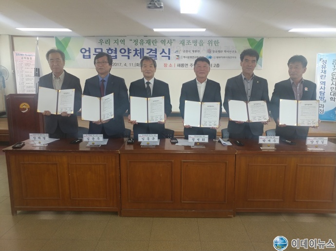 이데이뉴스 전남동부지역본부장 강진원 기자 순천시는 11일 지역 4개 기관·단체(역사문화연구원 마루, 전남동부지역사회연구소, 정유재란 역사연구회, 해룡면)와 전라남도의회(정병회 의원), 순천시의회(박계수 의원)가 참여한 가운데 정유재란 역사 재조명을 위한 업무협약을 체결했다.