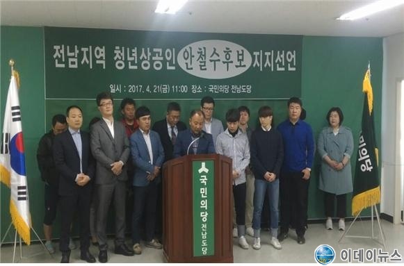 전남지역 청년상공인(대표 김상식)을 비롯한 20여명은 21일 오전 11시 남악 국민의당 전남도당(위원장 정인화)에서 기자회견을 통해 제19대 대선주자인 국민의당 안철수 후보를 적극 지지한다고 선언했다.