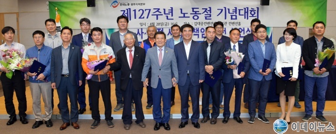 윤장현 광주광역시장이 28일 오후 서구 김대중컨벤션센터 본관 컨벤션홀에서 열린 ‘한국노총 광주지역본부 제123주년 노동절’ 기념행사에 참석해 노·사·민·정 사회적책임실천 선언문에 서명한 뒤 기념촬영을 하고 있다.