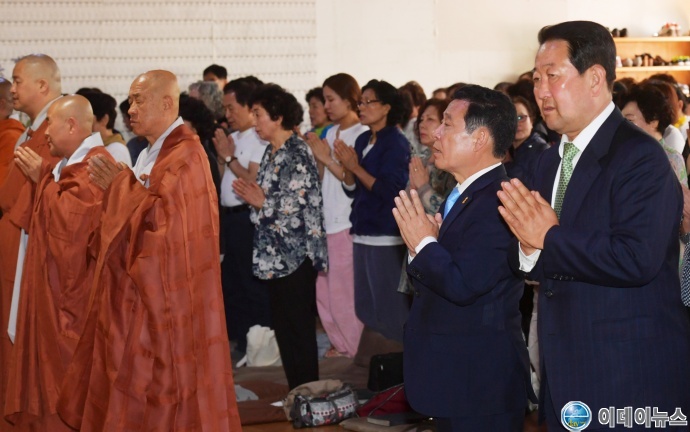 윤장현 광주광역시장(오른쪽 두번째)이 3일 오전 서구 무각사에서 열린 불기 2561년 부처님오신날 봉축 법요식에서 합장을 하고 있다.