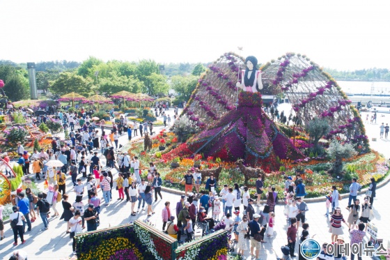행복의 성 뒤 커다란 화면 속에 비치는 나를 찾아보는 것도 특별한 즐거움 중 하나. 매일 밤 9시까지 다채로운 공연과 풍성한 이벤트로 가득 채우는 2017고양국제꽃박람회는 오는 14일까지 개최된다.