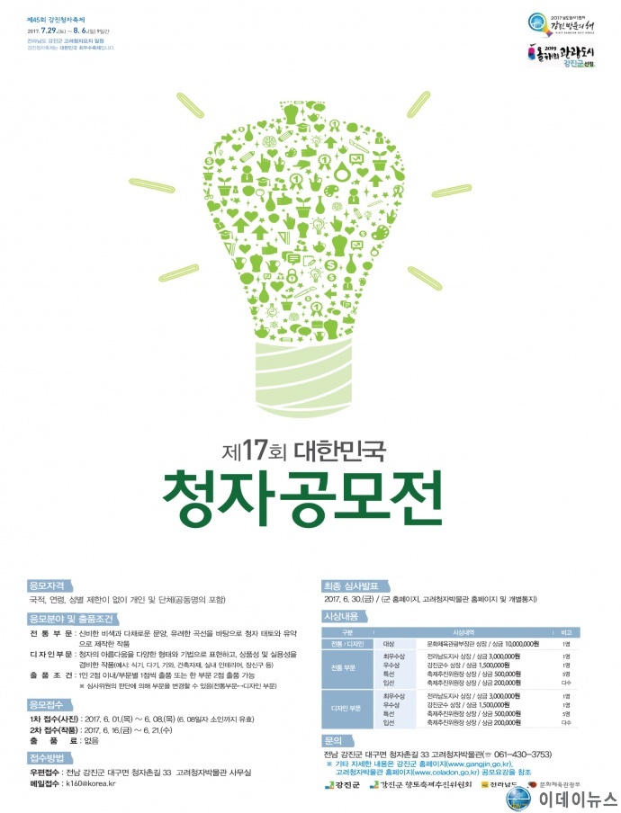 강진원 강진군수는 “우리 청자의 아름다움은 이미 전세계가 인정하고 있다. 이를 새로운 창조의 원동력으로 이끌어 나가기 위해 열일곱번째 대한민국 청자공모전을 마련했다”며 “침체돼 있는 도자산업에도 불구하고 끊임없이 새로운 작품을 탄생시키기 위해 노력하고 있는 모든 도예가들에게 박수를 보내고 젊은 작가들의 적극적인 참여를 기대한다”고 말했다. 기타 문의 사항(061-430-3753).
