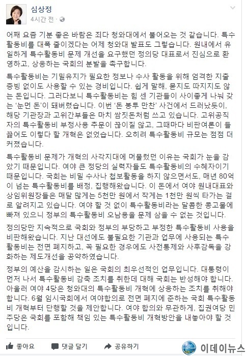 심상정 대표는 이날 자신의 페이스북에 글을 올리면서 "여야 4당은 청와대의 특수활동비 개혁에 상응하는 조치를 취해야 한다"고 거듭 주장했다.