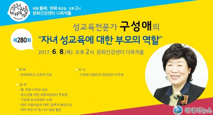 순천시가 시민들을 위한 다양한 인문학 강연을 제공하는 순천사랑아카데미는 8일 오후 2시 문화건강센터 다목적홀에서 구성애 성교육 전문가를 초청해 강연을 진행한다.