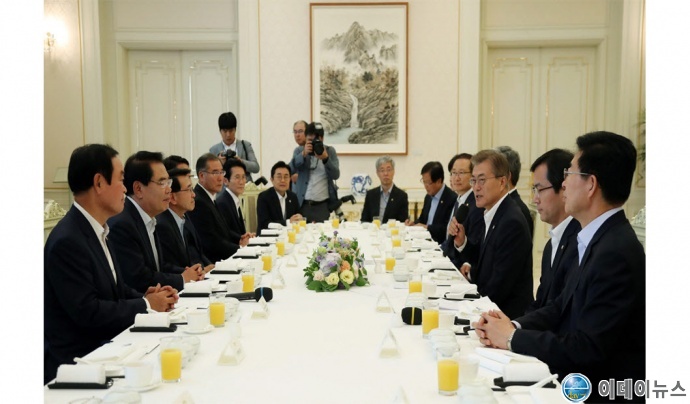 문재인 대통령은 인사말에서 “추경 예산안이 상임위와 예결위 조속 심사를 통해 하반기 집행이 이뤄질 수 있도록 도와주십사 부탁드리려 이렇게 모셨다. 추경의 요건 충족에 다소 이의가 있을 수 있겠지만 경기침체나 국채발행 증세 부담 없이 할 수 있는 점, 수출 등 경제 지표가 좋아지고 있는 시기에 내수와 고용을 만들어 낼 수 있다면 내리막길을 걷던 경제성장률을 다시 상승시킬 수 있다는 희망, 이런 것들을 고려하여 힘을 모아 주시기를 당부 드린다.