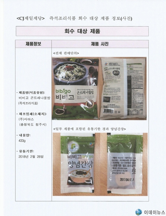 회수 대상은 6월 8일 홈쇼핑으로 판매된 유통기한이 2018년 2월 28일인 ‘비비고 곤드레나물밥’ 제품으로 생산량은 9,389 kg(433g × 21,684개)이다.