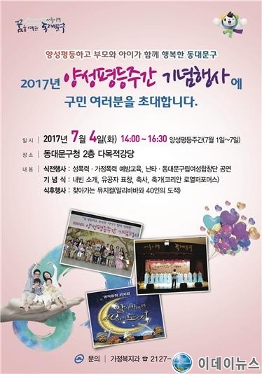 서울 동대문구가 2017년 양성평등주간(7월 1일~7일)을 맞아 구민들의 양성평등에 대한 인식을 높이기 위한 다채로운 행사를 마련했다.