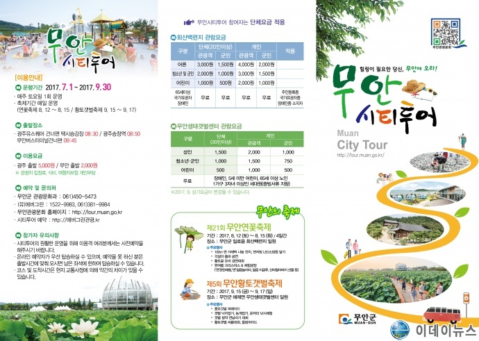 전남 무안군은 무안의 주요 관광지를 하루에 둘러볼 수 있는 ‘무안시티투어’를 오는 7월1일부터 9월30일까지 운영한다고 밝혔다.