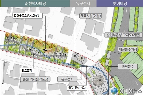 서문터정원(금곡사거리~매산뜰주차장)에는 순천역사 변천과정과 물길조성, 유구전시, 바닥분수, 마을정원 등이 조성되며, 이번 공모에서 최종 선정된 작품(부지면적 150㎡, 높이 4m)이 서문터정원 내 설치될 계획이다.