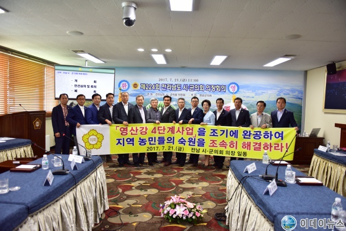 지난 21일 영광군의회 간담회실에서 개최된 전남 시군의회 의장회 정기회의에서 무안군의회 이동진 의장이 대표 발의한 「영산강 4단계사업 조기완공 건의문」을 만장일치로 채택하고 국회와 중앙정부에 전남 의장회의 강력한 의지를 전달하기로 의결했다.