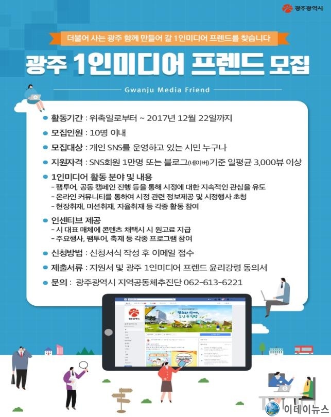 광주광역시는 소셜미디어 운영자의 참여와 다양한 콘텐츠 확보를 위해 ‘광주1인미디어 프렌드’를 오는 7일부터 18일까지 모집한다. 1인 미디어는 개인 블로그나 SNS 등을 기반으로 해 개인이 다양한 콘텐츠를 생산하고 공유하는 의사소통 구조로 지원자격은 개인 SNS 회원수 1만명 또는 블로그(네이버)기준 일평균 3000뷰 이상이며, 현장 취재활동을 할 수 있는 시민 누구나 가능하다.