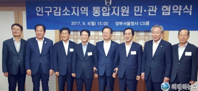 이날 협약식에는 김부겸 행정안전부 장관을 비롯해 지난 7월 인구감소지역 통합지원 공모사업에 선정된 전국 9개 지자체장과 5개 민간기업이 참석했다.