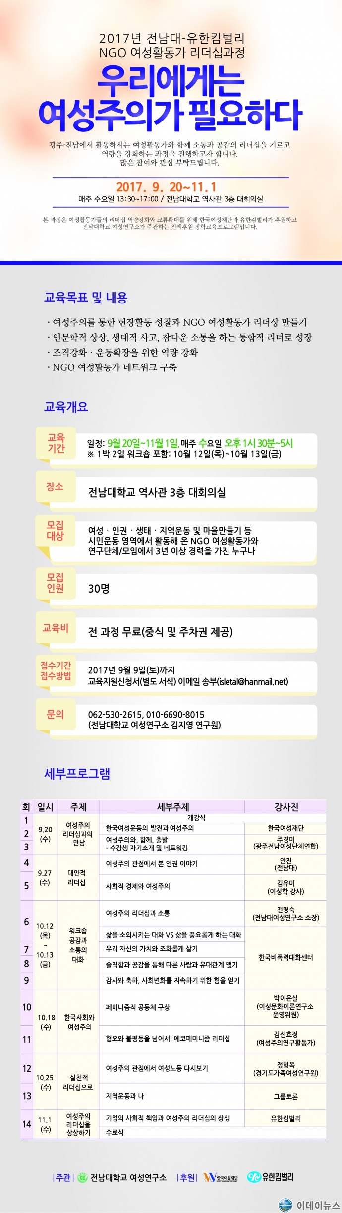 본 과정은 여성활동가들의 리더십 역량강화와 교류확대를 위해 한국여성재단과 유한킴벌 리가 후원하고 전남대학교 여성연구소가 주관하는 전액후원 장학프로그램으로 교육비는 무료이며, 모집인원은 30명, 모집기간은 9월 15일까지이다.