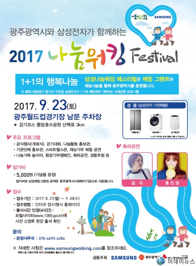 광주광역시가 나눔문화를 확산하기 위해 삼성전자와 함께 개최하는 ‘나눔워킹페스티벌’이 오는 23일 광주월드컵경기장 남문주차장에서 열린다.