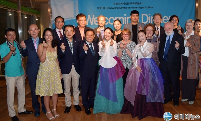 윤장현 광주광역시장이 20일 오후 동구 국립아시아문화전당 트레블라운지에서 열린 '유네스코 세계 인권기록 국제학술회의' 리셉션에 참석해 해외 유네스코 인권전문가에게 홍성담 작가의 ‘횃불행진’ 목판화 작품(1983년 작)이 새겨져 있는 꽹과리를 선물하고 국내·외 인권전문가 등 주요 인사들과 기념촬영을 했다.