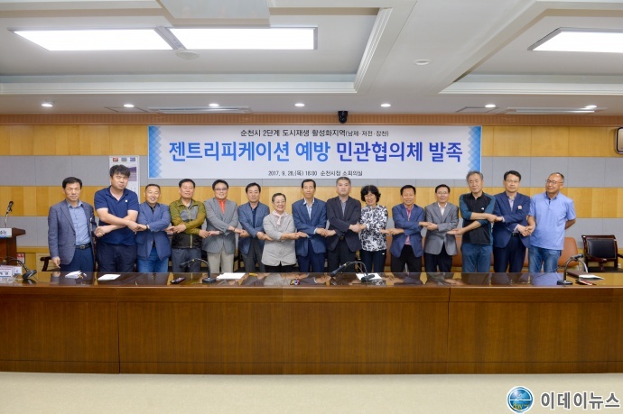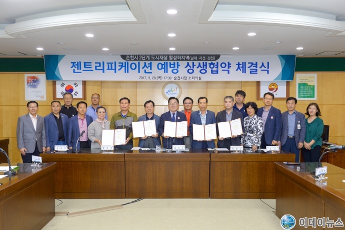 순천시는 2단계 도시재생활성화지역(남제․저전․장천) 내 도시재생 뉴딜사업에 앞서 젠트리피케이션 현상을 사전에 방지하기 위해 지난 28일 순천시, 희망 건물주 대표, 주민협의체가 젠트리피케이션 예방 상생협약을 체결했다.