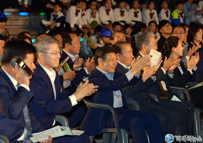 윤장현 광주광역시장이 29일 오후 광산구 수완호수공원 야외 무대에서 열린 '제26회 광산구민의 날' 기념행사에서 민형배 광산구청장, 장휘국 광주시육감, 김동철 국회의원, 권은희 국회의원 등 참석자들과 식전 공연을 관람하고 있다.