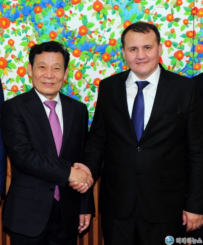 윤장현 광주광역시장이 7일 오후 시청 3층 접견실에서 악탐 카이토프 우즈베키스탄 고용부장관 접견 후 기념촬영을 하고 있다