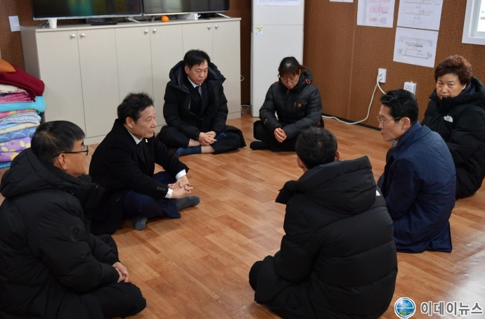 윤장현 광주광역시장(왼쪽)이 18일 오전 목포 신항에 마련된 세월호 미수습자 가족 숙소를 찾아 가족들을 위로 한 뒤 세월호 선체 앞에서 세월호 광주시민상주모임 조계현씨와 대화를 나누고 있다.